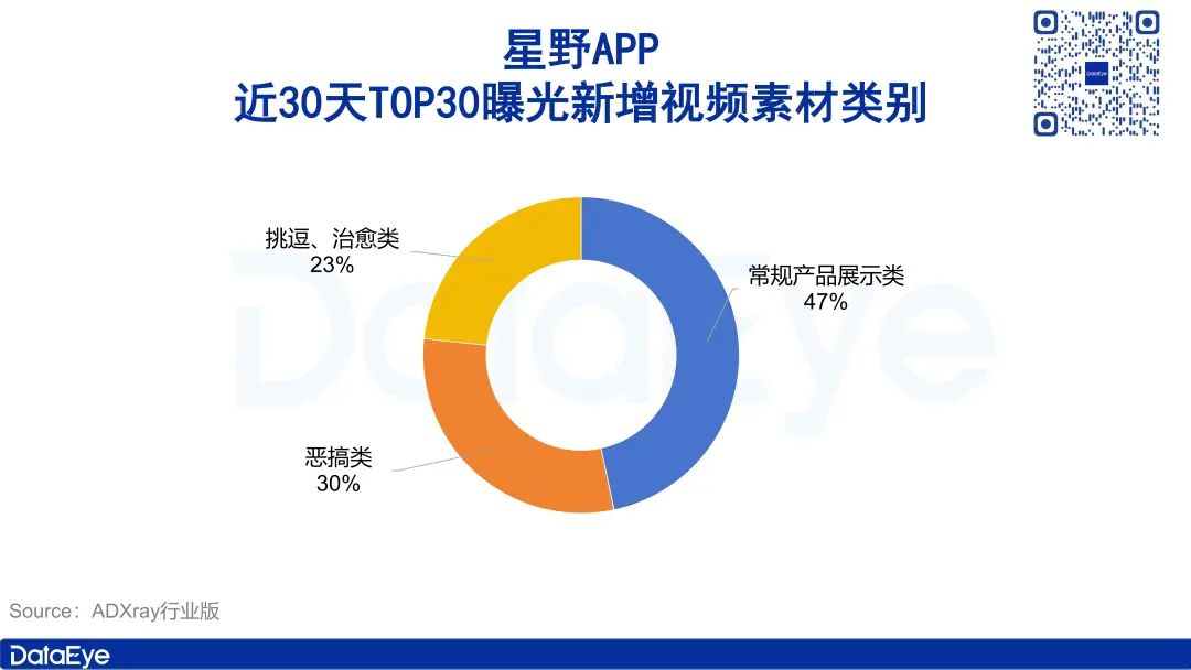 其中,常规产品展示类素材14条,占比47%;恶搞类9条,占比30%;挑逗治愈类素材7条,占比23%。