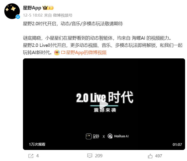12月5日,星野APP官方微博发布动态称“星野2.0时代开启”,利用海螺AI视频模型升级为星野带来更多新玩法。