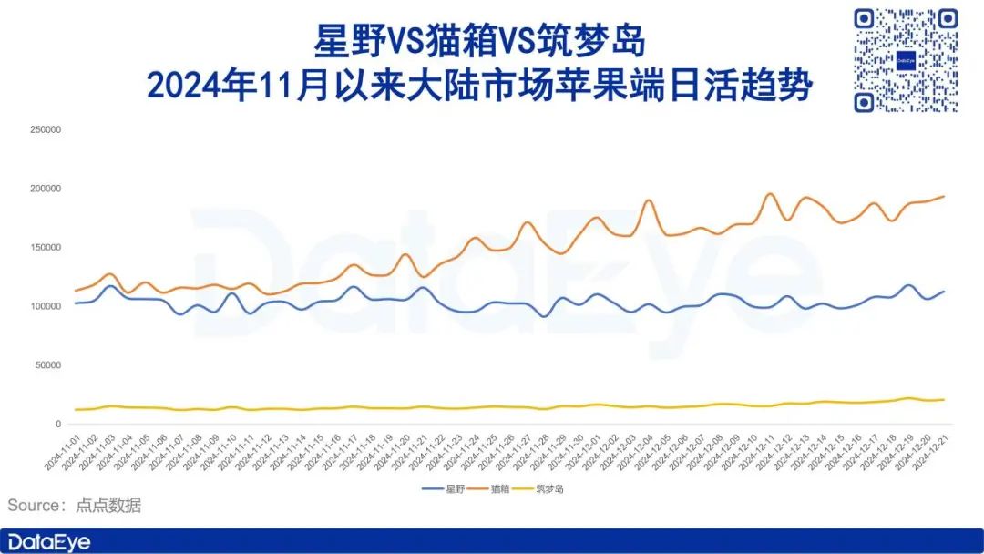 点点数据显示,星野在11月下旬至12月中旬,大陆市场苹果端下载量非但没有明显上升,反而有下降趋势,直至近日才有回升;日活数据与下载量基本一致,有轻微下滑。