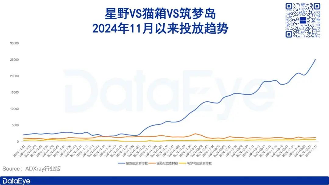 ADX行业版数据显示,11月以来,星野投放力度增长明显,从日均2500组左右,攀升至最高单日2.5万组素材量,投放力度提高达10倍。