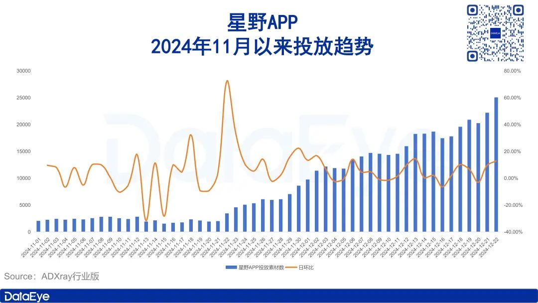 从时间维度上看,星野APP自11月22日起投放力度开始持续攀升,日环比高达72.29%,投放素材量于近期达到最高点,单日最高投放素材量超2.5万组。