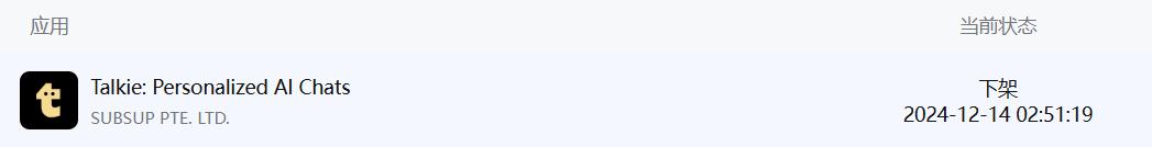 点点数据显示,2024年12月14日凌晨,Talkie在美国市场App Store被下架,而在此前的11月30日,Talkie便已经从日本市场App Store下架。