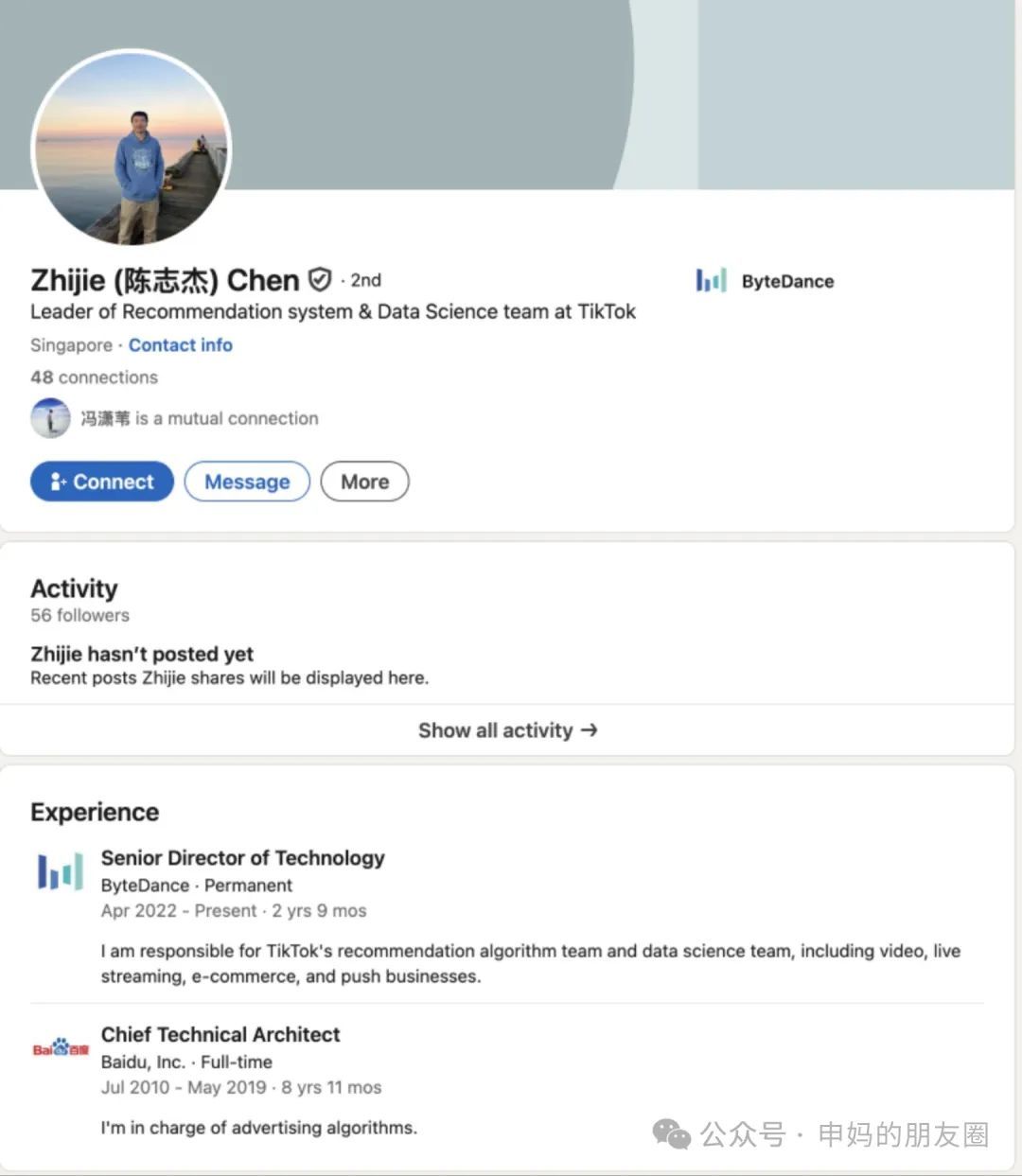 根据领英的资料,陈志杰2022年4年加入字节,担任高级技术总监(按这个职级,应该是4-2),负责Tik Tok的推荐算法和数据科学团队,包括短视频、直播、电子商务和推送业务。2010年7月-2019年5月,陈志杰在百度工作,担任广告算法工程师。