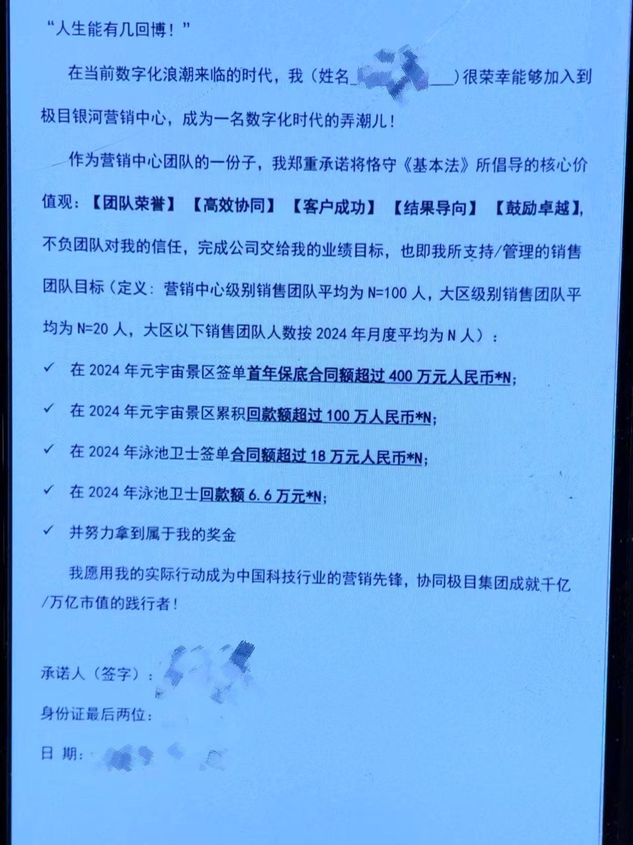 更令人匪夷所思的是,「极目银河」对于销售团队的管理是“签军令状”——让每个事业部的销售签署文件,承诺要在2024年内完成项目几十到几百万不等的营收或回款,并签署身份证的后两位。