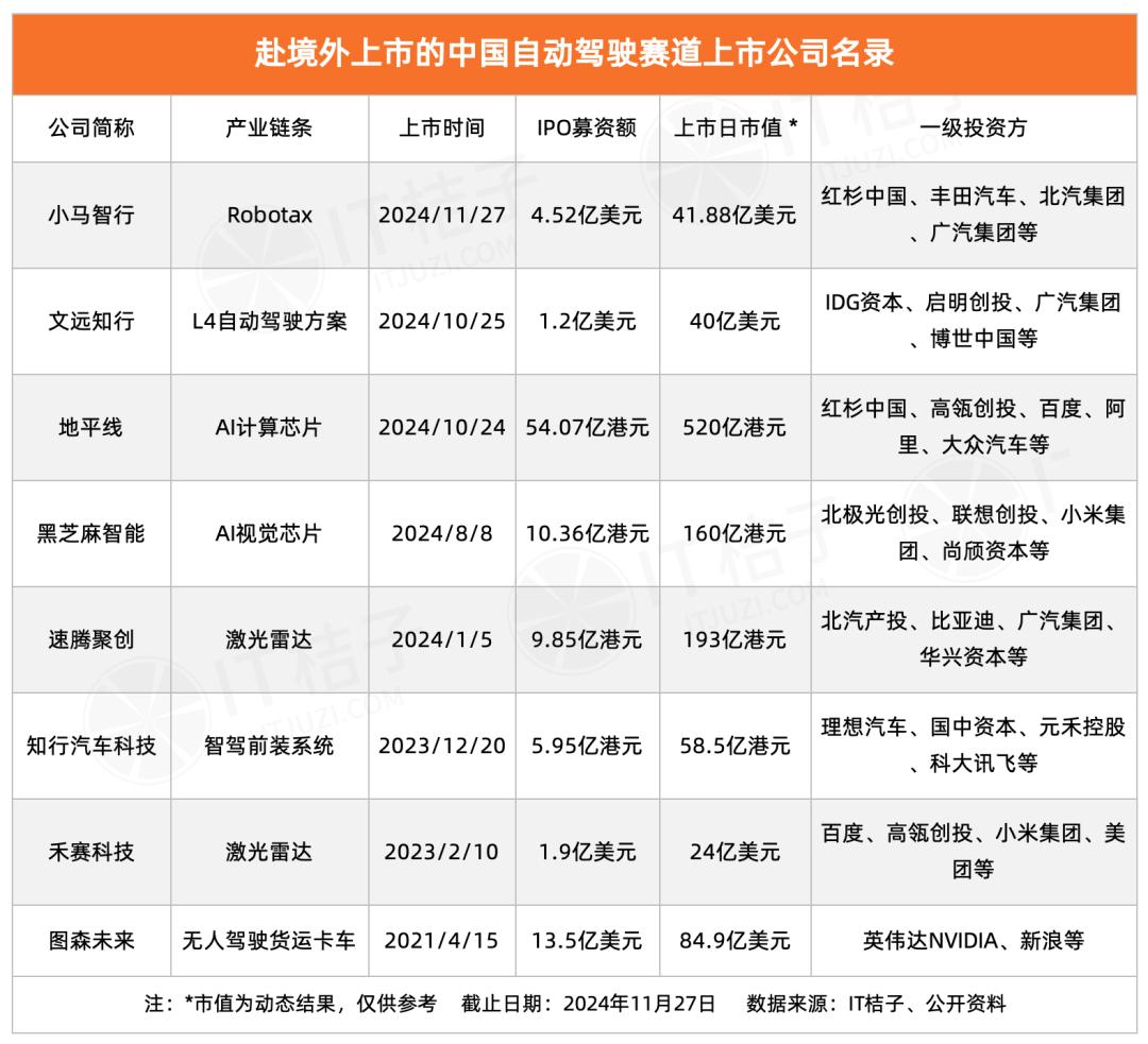 小马智行Pony.ai,于2024年11月在美股纳斯达克上市,市值41.88亿美元,专注于自动驾驶出行服务,获得红杉中国、丰田汽车、北汽集团、广汽集团等投资;