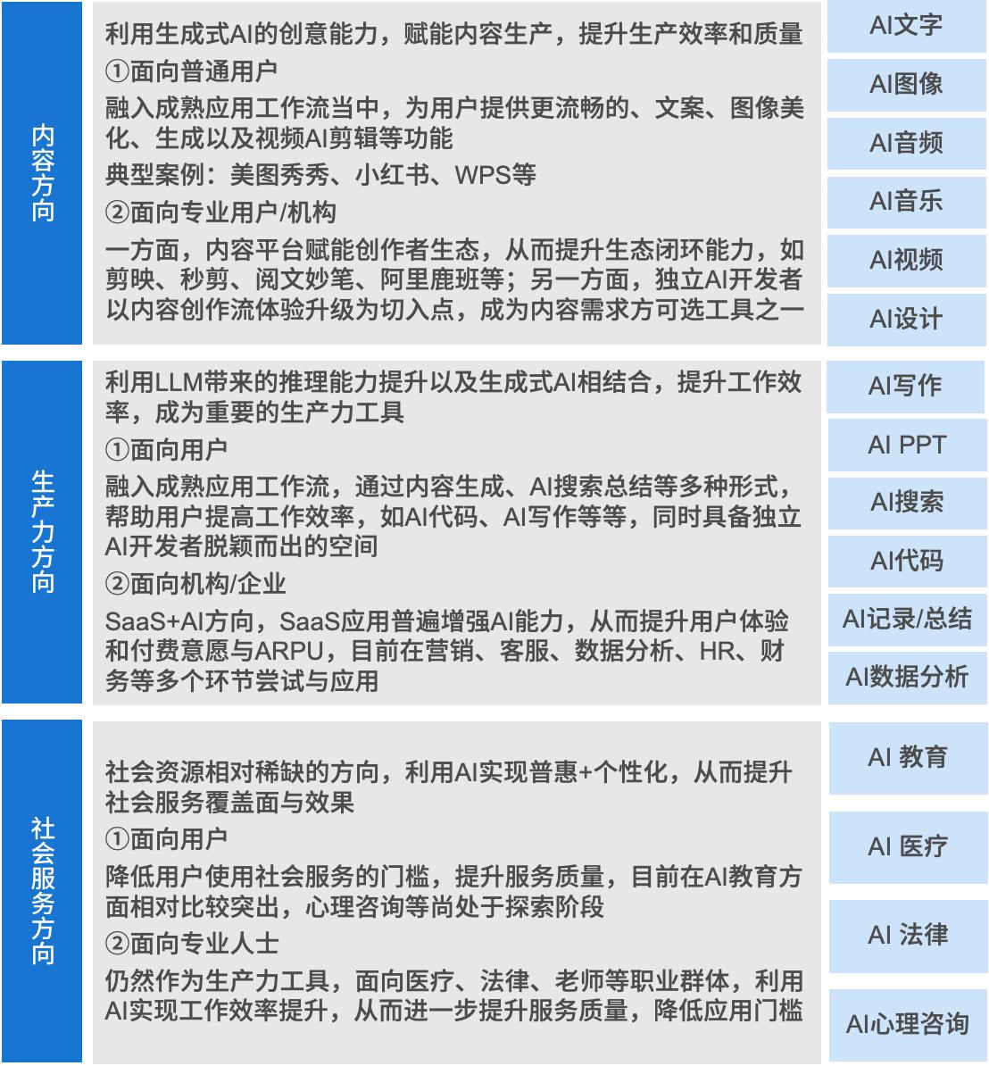 在 LLM 驱动的 AI 应用环节,涌现出各种细分方向与产品,通过海量用户推广、培养用户习惯、提升用户粘性等方式验证产品 PMF,论证赛道核心价值。总体上而言,经过 2023-2024 年的多元化探索,如下三个方向基本在一定程度上验证,并有望持续扩大用户规模,进而实现用户付费与转化。