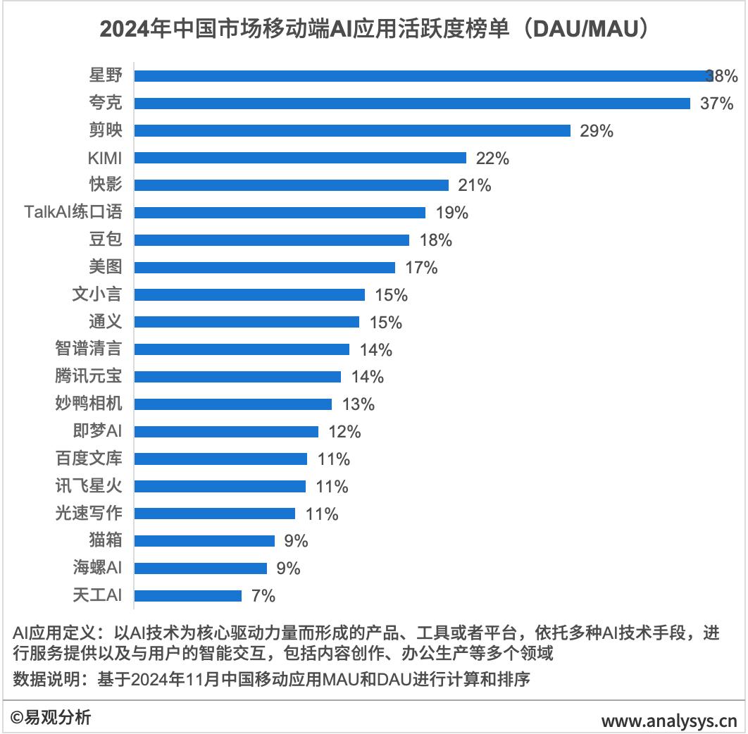 夸克这一类相对综合型的 AI 应用,通过场景覆盖相对全面,产品体验初步达到预期,赢得用户持续访问。AI+社交属性以及 AI+教育体现出了比较高的粘性,尽管星野聚焦 AI 社交、TalkAI 练口语聚焦 AI 教育,用户规模均不足千万,但是在用户活跃度方面表现突出。剪映、快影等视频创作应用依托于抖音、快手内容分发生态,以及 AI 赋能的用户创作体验,也位居前列。与用户规模榜单相结合,可以看出,依托科技大厂和成熟应用的场景和资源优势,结合用户体验的持续升级,有助于构建用户护城河,而独立公司则更需要发挥自身在细分赛道的持续深耕,占据一席之地。