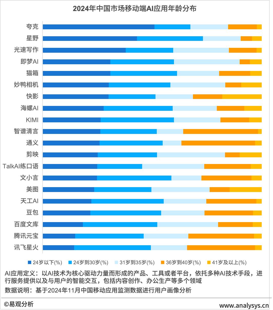 从用户画像上来看,大部分 AI 应用的主要用户群体集中在 30 岁以下的年轻人,超过 50%,甚至夸克、猫箱、星野、即梦等应用,24 岁以下年轻人占比超过三成,其中,夸克 24 岁以下年轻用户占比超过一半。40 岁以上用户群体基本上只占到 10%的比重。一方面,新兴技术和应用确实能够更加快速在年轻用户群体当中渗透和普及,另一方面,年轻用户更多利用内容创作与发布来社交表达和交流,以及寻求工具应用帮助提升自身效率的特性,也确实与当前 AI 应用的核心价值相匹配。