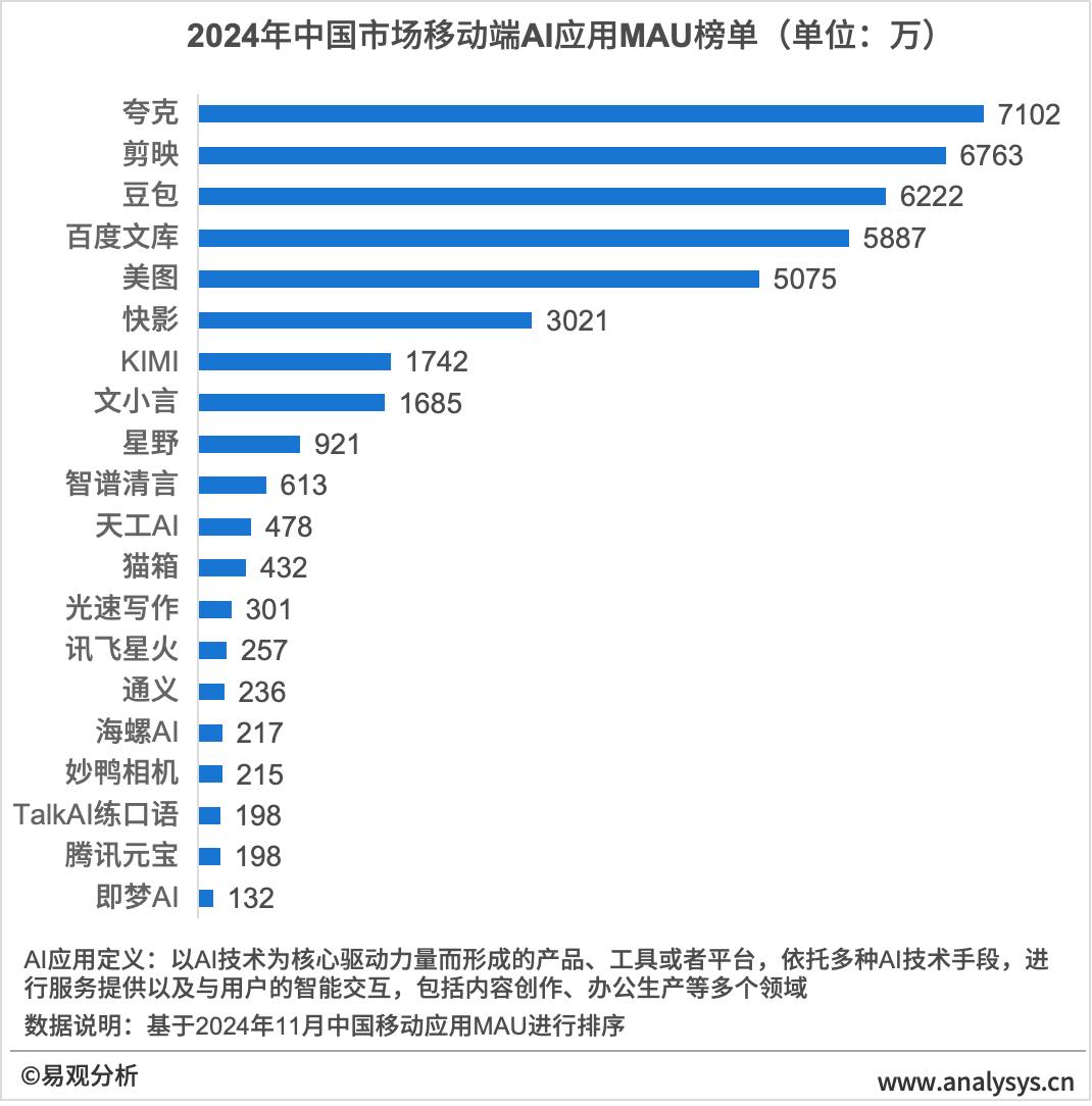 相应地,基于 2024 年 11 月数据,中国 AI 应用-移动端格局如下:夸克第一,剪映和豆包处于第一梯队,其一,一站式 AI 应用为用户提供聚合服务,AI 矩阵效应凸显,如夸克、豆包等;其二,内容创作类应用赢得当前用户尝试与体验,如剪映、百度文库等;其三,科技大厂与成熟应用凭借其用户场景与资源投入,跑赢 AI 应用第一阶段,如阿里系-夸克、字节系-剪映 &豆包、百度系-百度文库等。