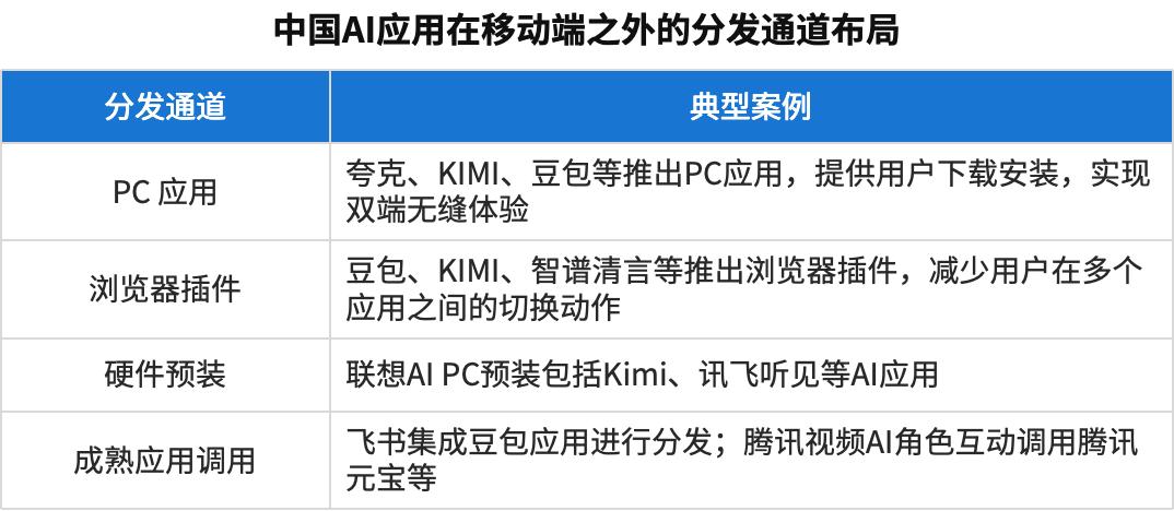 鉴于 AI 应用的场景特性,解决内容与生产力效率为核心,移动应用也只是 AI 应用分发的一个切面,AI 场景的渗透面向 PC 桌面与面向成熟应用联动,也是当前 AI 应用重要的分发通道。未来 AI 应用在移动端应用规模的基础上持续增长,一方面需要不断优化移动端用户体验与产品能力,另一方面,也需要在如下多类型分发通道方面因地制宜,形成更广泛有效的生态策略,实现 AI 应用用户规模的下一轮跨越式增长。