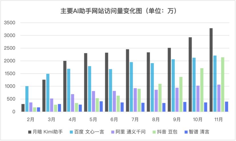 投流是典型的“大力出奇迹”式操作。AI产品榜数据显示,自今年2月到11月,Kimi网站访问量从最初的305万飙升到3282万;豆包则一路从173万增长到2143万。