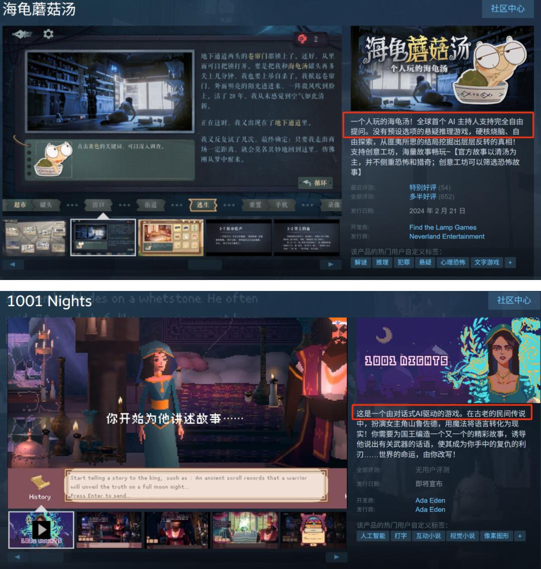 一些比较成熟的AI游戏如《海龟蘑菇汤》和《一千零一夜》。在《海龟蘑菇汤》中,玩家无论说什么内容,AI都会将剧情引导到主线。《一千零一夜》中,AI可以生成玩家想象中的任何武器。