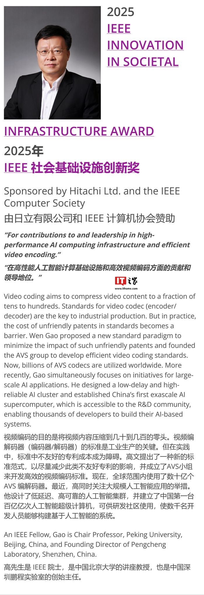 IT之家 12 月 26 日消息,高文院士因其在高性能人工智能计算基础设施和高效视频编码方面的贡献和领导地位,荣获 2025 年度 IEEE 社会基础设施创新奖(IEEE Innovation in Societal Infrastructure Award),成为首位获得该奖项的中国科学家。