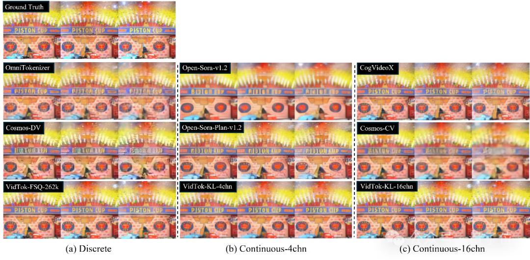 为了全面评估VidTok在各个设定下的重建性能,作者将VidTok与最先进的连续和离散视频Tokenizer分别进行了对齐设定下的比较。所有模型均为4x8x8倍视频压缩率的因果模型,主要包含以下三种设定: