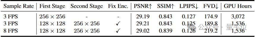 VidTok采用一种两阶段训练方法来应对这一挑战:首先在低分辨率视频上对完整模型进行预训练,然后仅在高分辨率视频上微调解码器。这种训练策略显著降低了计算成本——训练时间减少了一半(从3,072GPU小时降至1,536GPU 小时),而保持重建视频质量不变。