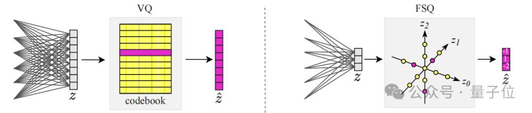 有限标量量化(FSQ)由「Finite scalar quantization: Vq-vae made simple」提出,其核心原理是,在隐空间表征中,每个标量条目通过四舍五入独立量化到最近的预定义标量值。