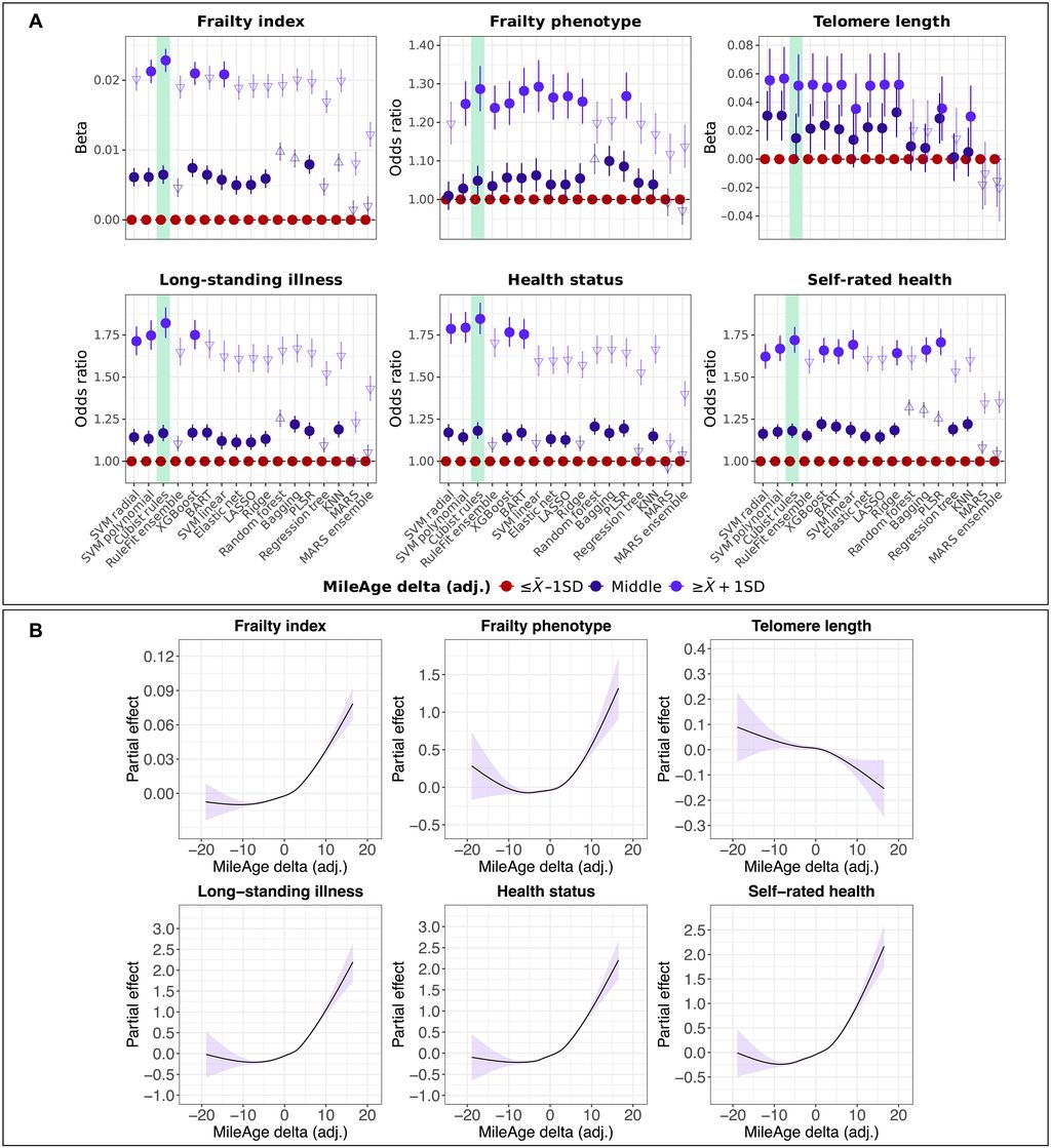 研究发现,MileAge 大于实际年龄(即生物年龄加速)的个体,通常身体更虚弱,更容易患慢性疾病,自评健康状况较差,且死亡风险更高。他们也拥有更短的端粒(细胞衰老的标志),与动脉粥样硬化等老年疾病相关。