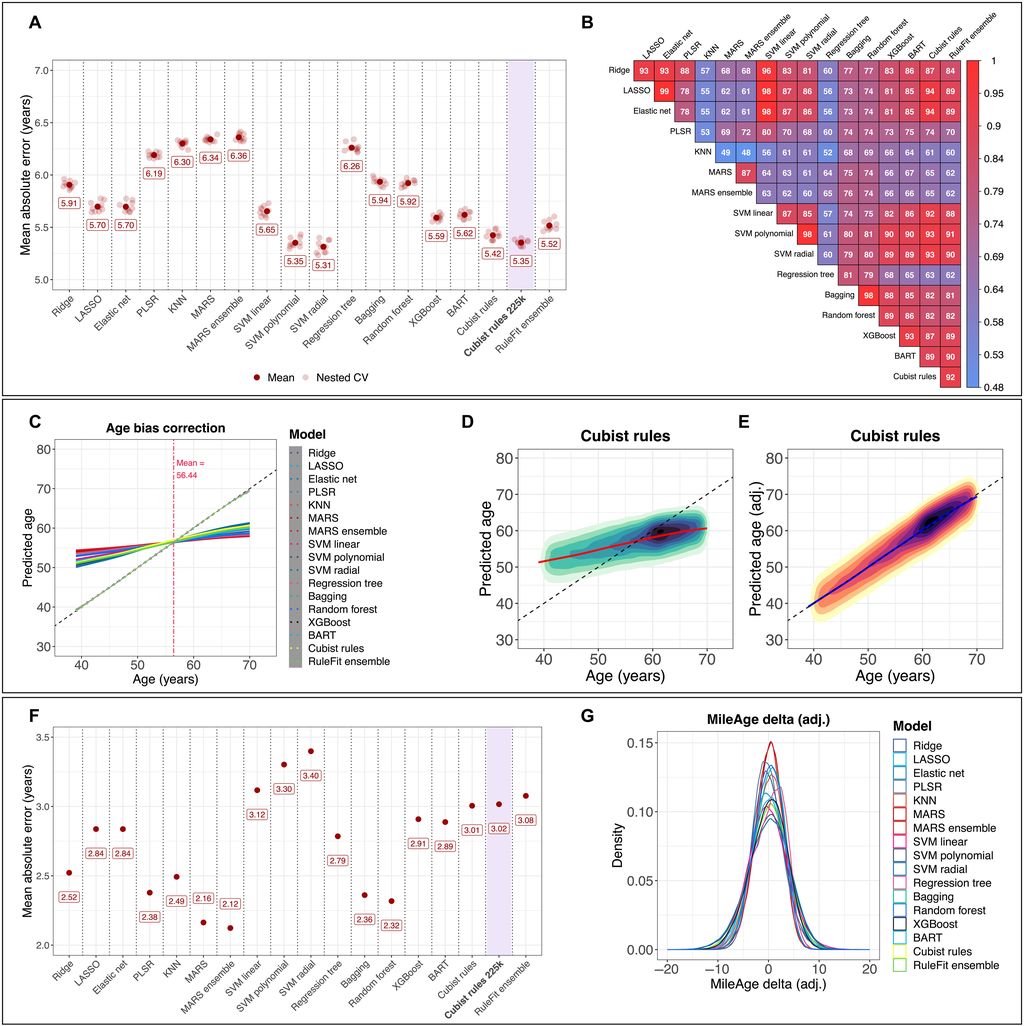 研究使用了英国生物样本库超过 22.5 万名参与者的血液标记数据,这些参与者在招募时的年龄在 40 至 69 岁之间,训练和测试了 17 种机器学习算法,发现非线性机器学习算法,特别是 Cubist 回归模型,表现最为出色。