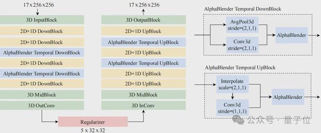 详细的网络架构如上图所示。VidTok分别处理空间采样和时间采样模块,并在时间采样模块中引入了AlphaBlender操作符。其余组件,包括输入/输出层和瓶颈层,则利用3D卷积来促进信息融合。此外,整个架构中引入了层归一化以增强稳定性和性能。实验证明该架构在重建质量和计算量之间取得了平衡。