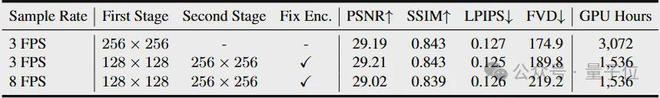 VidTok采用一种两阶段训练方法来应对这一挑战:首先在低分辨率视频上对完整模型进行预训练,然后仅在高分辨率视频上微调解码器。这种训练策略显著降低了计算成本——训练时间减少了一半(从3,072GPU小时降至1,536GPU 小时),而保持重建视频质量不变。