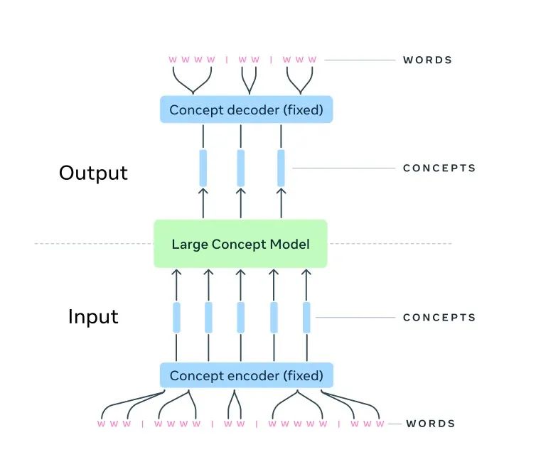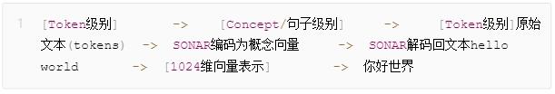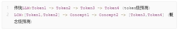 SONAR是在token和最终理解之间搭建了一座桥梁,让模型既能跳过token,直接把握更高层的语义关联。LCM所接受和输出的就只有概念向量。