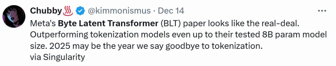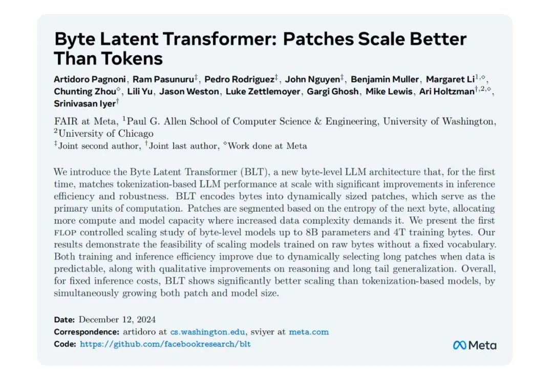 12月12号,Meta还发布了一篇备受讨论的论文《Byte Latent Transformer: patches Scale Better Than Tokens》同样是试图打破tokenization的霸权。