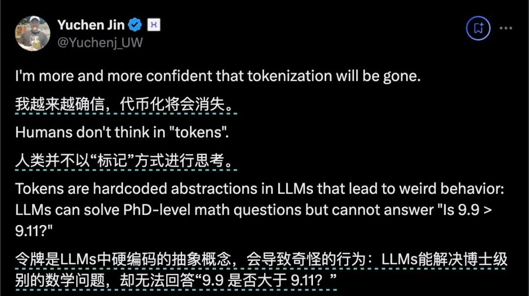 Hyperbolic的CTO Yuchen Jin就表示,人类并不以“token”的方式进行思考。而是以“概念”的形式去思考。