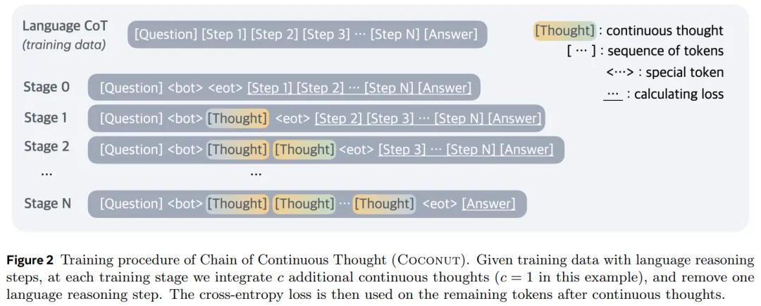 它的逻辑训练方式也一样相对特殊,在前几步训练时,它还是采用一般思维链的方式训练,用话语和token作为要素训练模型,在之后他们逐渐加多“想法”的占比,直到最后完全用“想法”取代token形成的语句。