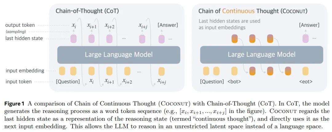 在这个叫Coconut的思维链中,Meta的研究员直接利用最后一个隐藏状态(即“想法”)作为下一个输入嵌入。整个推理过程是连续可微的,可以通过梯度下降来优化。
