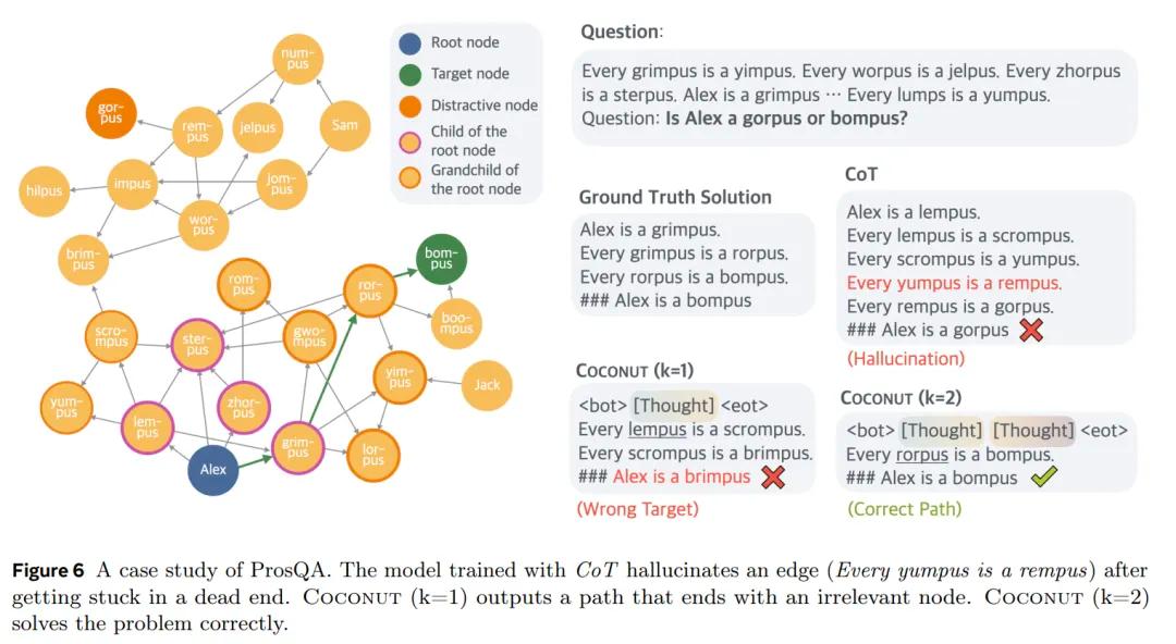 而且通过这一方法,LLM 推理就不光再是链式的,而是一个由最后一个隐藏状态引发的树状搜索序列,可以一次性选择多个潜在节点。更不容易出现由于第一个步骤确定后,无法引向正确节点的幻觉。