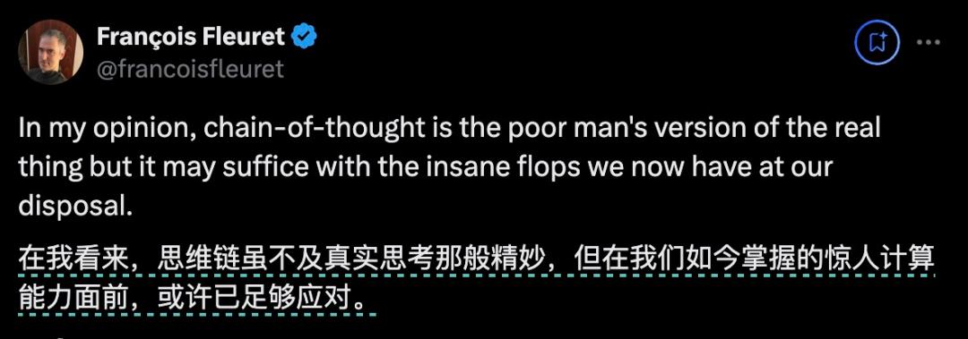 比如Meta的另一位研究员,日内瓦大学教授Francois Fleuret也认为OpenAI现在选择的COT之路,不过是一种“对真东西(人类思维)的劣化的模仿”。