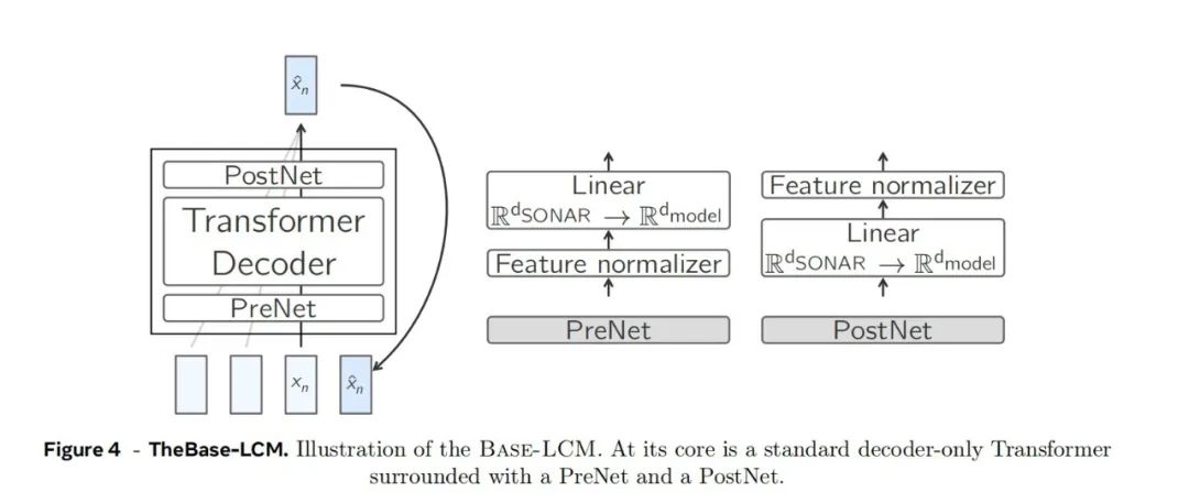 第一种是基础LCM架构。在这个方案中,前置网络(SONAR)首先处理输入文本的token序列,将其映射到概念空间中的向量表示。一个Transformer模型接收概念向量,然后预测之后的概念向量。最后,后置网络(SONAR)接收这个概念表示,尝试生成对应的目标语言表达。