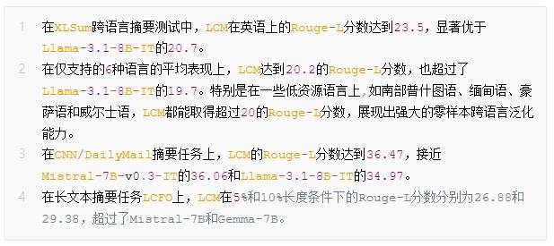 不过在文本扩展任务上,LCM的Rouge-L分数(30.85)低于主流LLM(如Llama-3.1-8B-IT的37.76)。