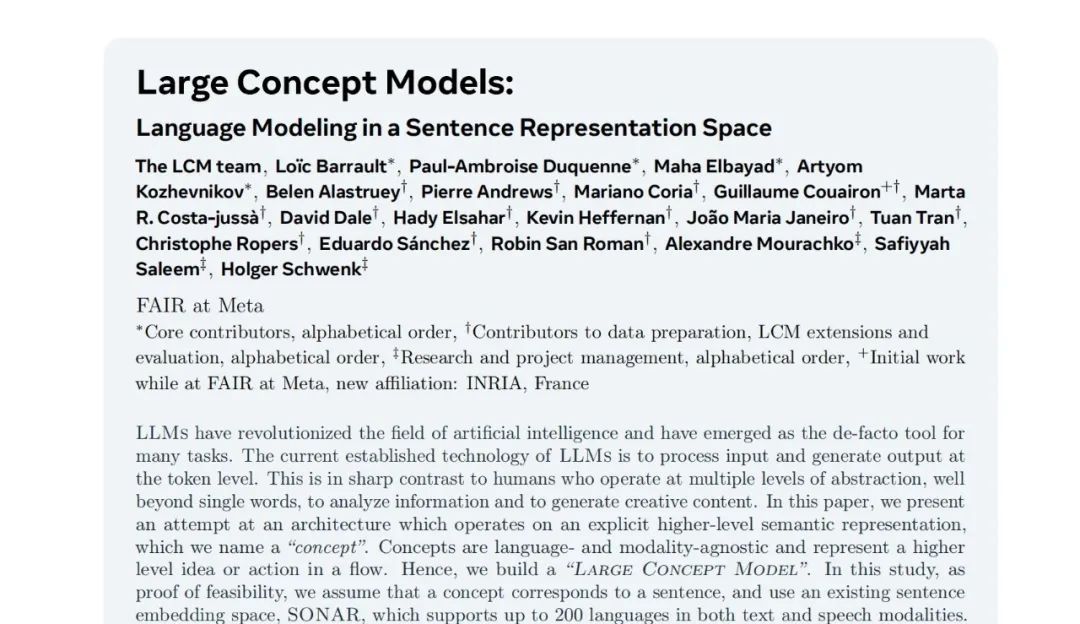 在整个12月,他们连发三篇论文,挑战token思维模式。最近的是在12月24日,Meta发表了一篇论文《Large Concept Models:Language Modeling in a Sentence Representation Space》,让大模型直接从概念学起。