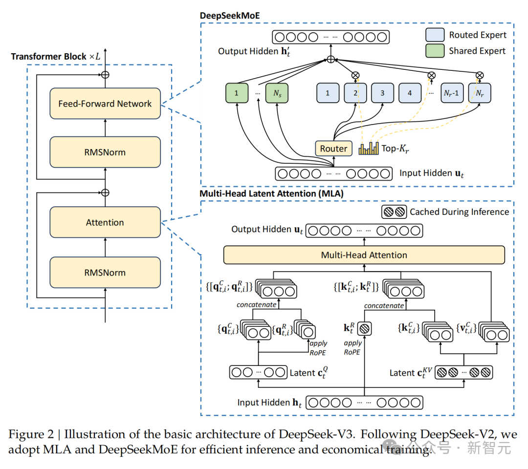 它继续采用了多头潜在注意力(MLA)来实现高效推理,以及DeepSeekMoE实现低成本训练。