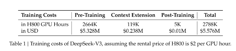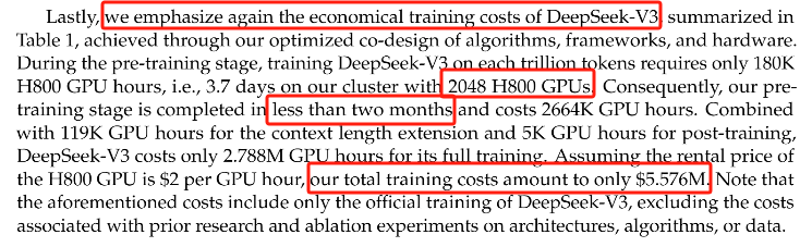 值得注意的是,幻方量化在已开源的论文中强调其训练成本极低——通过对算法、框架和硬件的优化协同设计,假设H800GPU的租用价格为每块GPU2美元/小时,DeepSeek-V3的全部训练成本总计仅为557.6万美元(注:该成本仅包括DeepSeek-V3的正式训练,不包括与先前在架构、算法或数据上的研究和消融实验相关的成本):