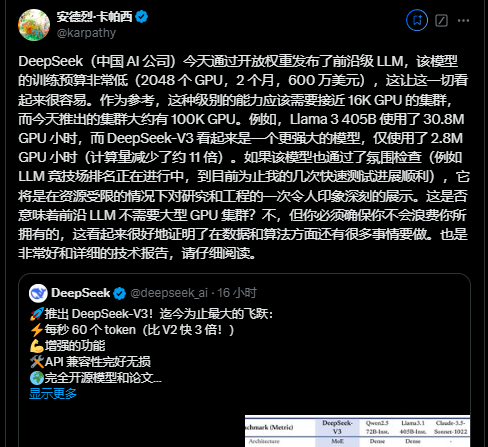 技术大牛Andrej Karpathy发文称赞道:作为参考,要达到这种级别的能力,通常需要约1.6万个GPU的计算集群。不仅如此,当前业界正在部署的集群规模甚至已经达到了10万个GPU。比如,Llama 3 405B消耗了3080万GPU小时,而看起来更强大的DeepSeek-V3却只用了280万GPU小时(计算量减少了约11倍)。(小K注:Karpathy是OpenAI的联合创始人之一,并且曾担任特斯拉的AI总监)