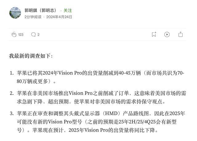 如果说硬件销售的家底让苹果保持住了光鲜亮丽的一面,那已经实质性宣告失败的造车计划,和暂时看不到前途的Vision Pro,则构成了今年苹果的另一面。