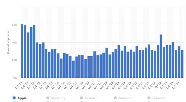 这点在苹果2024Q4业绩报告和出货量中也有所体现。根据近三年Q4业绩报告,iPad在22、23、24年Q4的收入分别为71.7亿美元、64亿美元和69亿美元,年收入占比分别为7.95%、7.15%、7.32%。出货量方面,22、23年全年出货量分别为6300万、5000万台,不难看出iPad在2023年“性能停摆”对其销量的影响之大。
