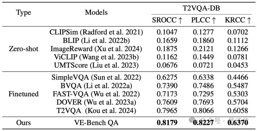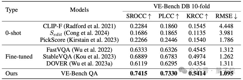 在构建的VE-Bench DB的基础上,团队还提出了创新的VE-Bench QA训练方法,目标是得到与人类感知更加接近的分数。