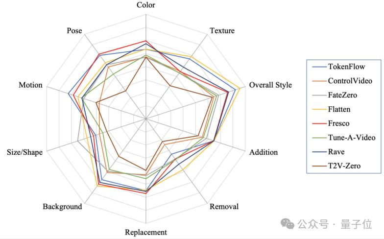 在此基础上,团队进一步绘制了不同视频编辑模型在VE-Bench提示词上的表现: