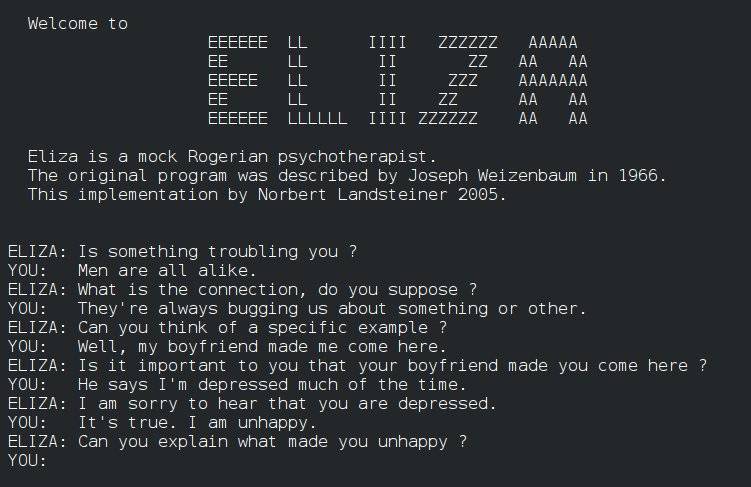 这台聊天机器人使用的主要技巧是部分地复述对方的用词和内容,引导对方进行更多的内容表达。这实际上是一个很简单的盘问以及谈话技巧。