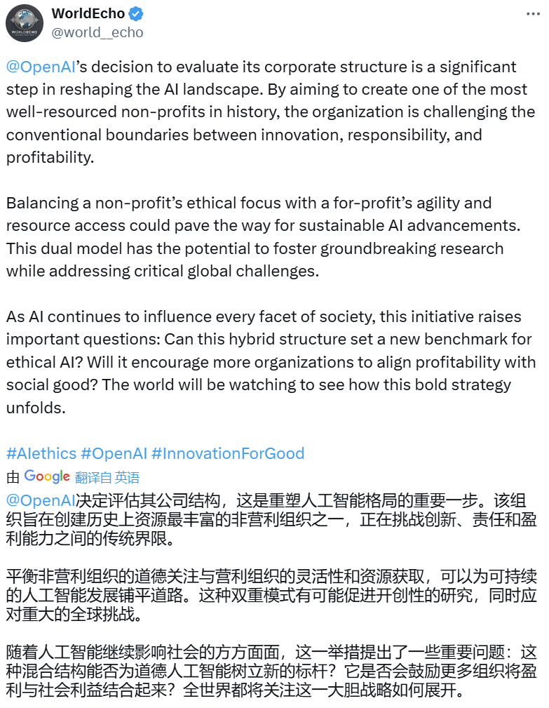 目前,大型公司在人工智能开发上的数千亿美元投资,显示了 OpenAI 继续追求使命所需的真正投入。我们需要再次筹集比我们想象的多的资本。虽然投资者想要支持我们,但在如此大规模的资本面前,他们需要常规的股权结构,而不是过于固化的结构。