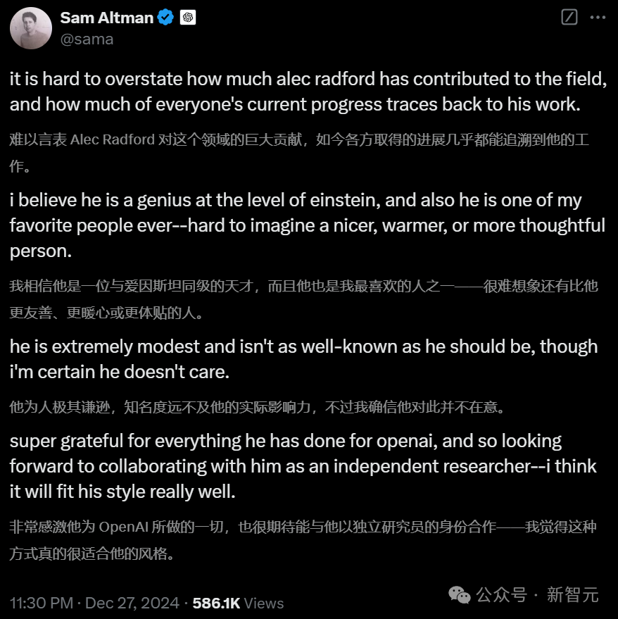 与此同时,奥特曼发文点名OpenAI研究员(大部分已经离职),表示感谢。