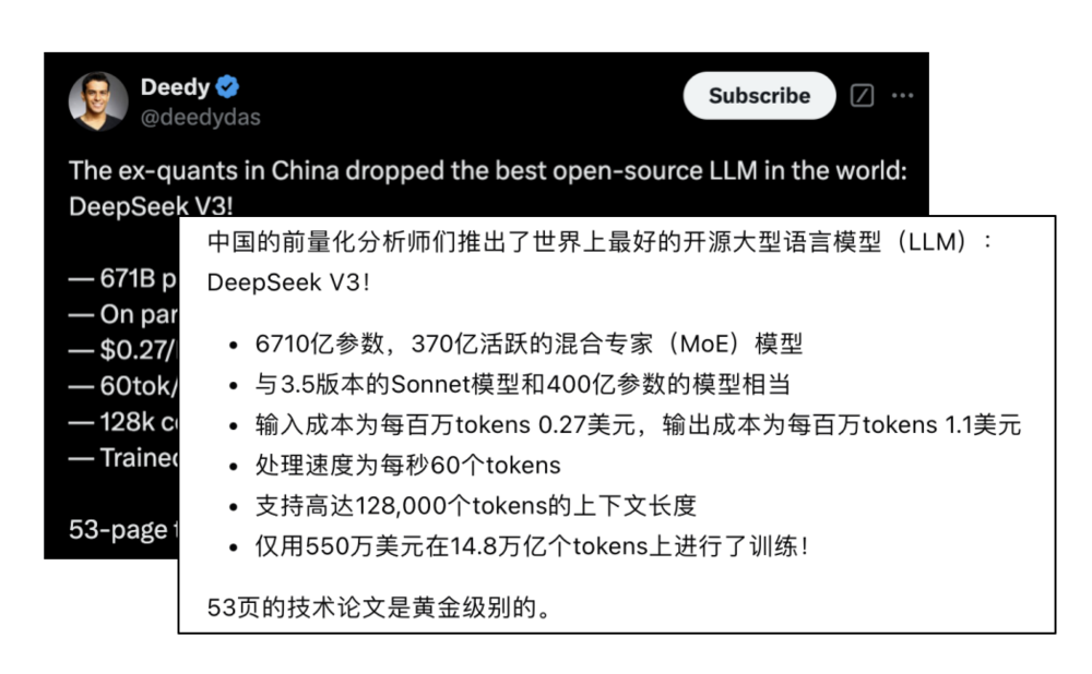 曾为 Glean 和 Google Search 的创始团队成员的 VC Deedy更是将DeepSeek-V3赞为“世界上最好的开源大模型”。