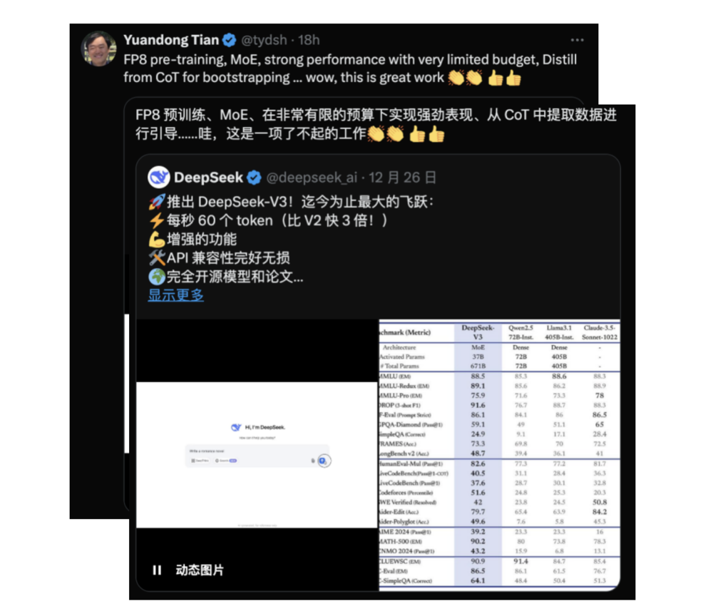 Meta AI 研究科学家田渊栋在X上对 DeepSeek-V3 “极有限的预算”和“强劲的表现”深感惊喜。
