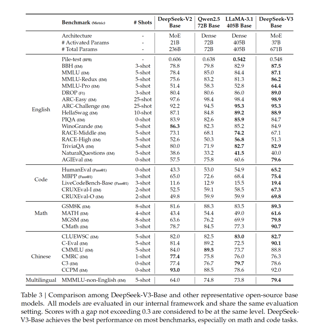 DeepSeek-V3的基础模型以英语和中文为主的多语言语料库上进行预训练,因此主要在一系列以英语和中文为主的基准测试上评估其性能,同时也在一个多语言基准测试上进行评估。而基于其内部集成的HAI-LLM框架,具体跑分如下:
