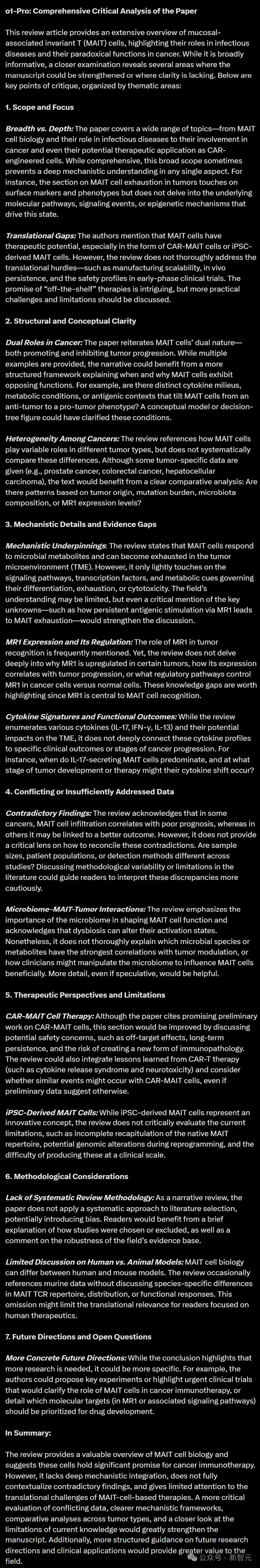 首先,o1 pro 指出文章涉及的主题范围过广,虽然涵盖了 MAIT 细胞的基本生物学、在传染病中的作用以及在癌症中的双重效应等,但在每个方面的探讨深度不够。