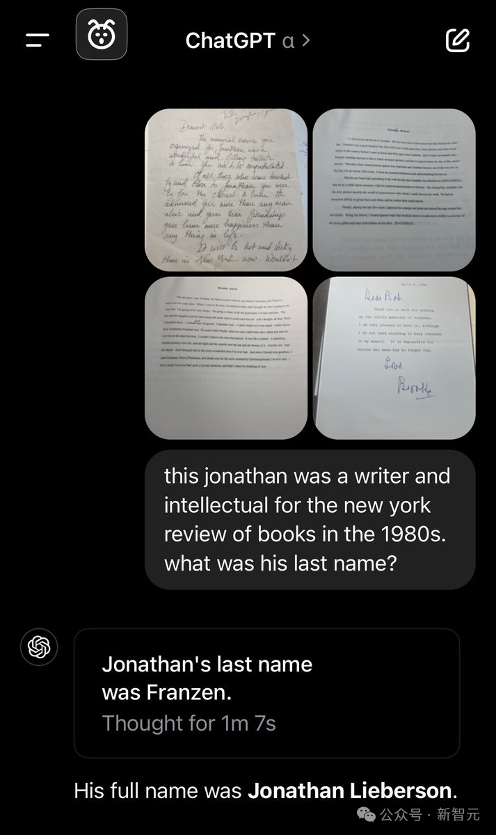她上传了 4 张图片给到 GPT-4o,并问道「这位 Jonathan 在 1980 年代是《纽约书评》的作家和知识分子。他的姓是什么」?