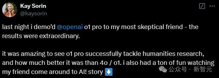 除了搞数理化很厉害,o1 pro 的人文社科能力也不差。OpenAI 营销研究员 Kay Sorin 亲自演示了 o1 pro 处理人文研究的能力,其效果远超 4o 或 o1。
